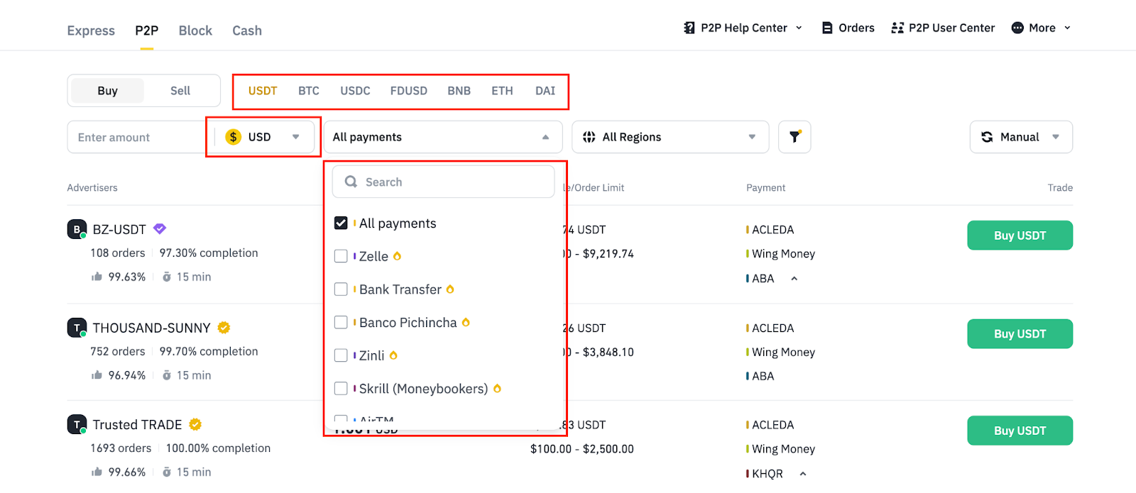 3. 浏览可交易的卖家列表,检查他们的费率和条款。